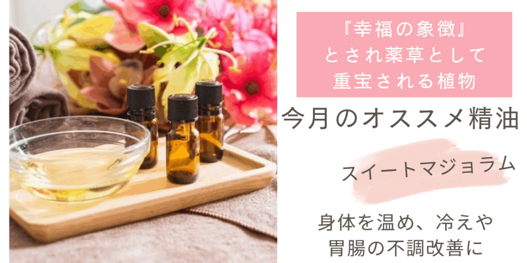 今月オススメ/マジョラム精油/幸福の象徴/冷え/胃腸の不調改善/肩こり/京田辺/新田辺駅/アロマ/リラク/エステ/マッサージ